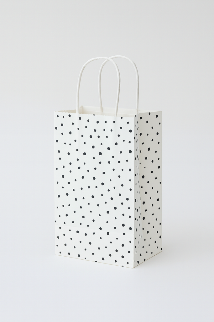 100 CASE Small 5"L X 3.5"D X 8.5"H White Modern Dot Paper Shopping Bags Reusable Paper Bags For Retail Stores, Craft Fairs, Party Favors, And Merchandise Packaging