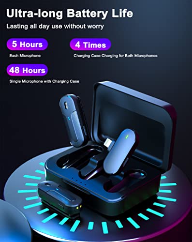 • 48 Hours Long Battery Life: The lavalier microphone for iphone has a built-in 70 mAh battery that can last up to 5 hours; the charging case with a built-in 600 mAh battery can provide up to 48 hours of battery life for the wireless microphone. Let you can use it outdoor hassle-free.